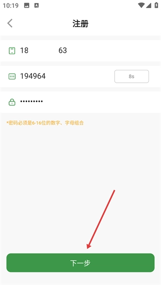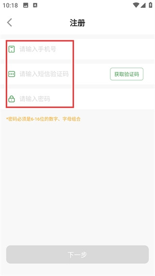在注册页面,按顺序填写【请输入手机号】【请输入短信验证码】【请输入密码】这三项内容,需要注意的是,密码必须是6到16位的数字与字母组合。