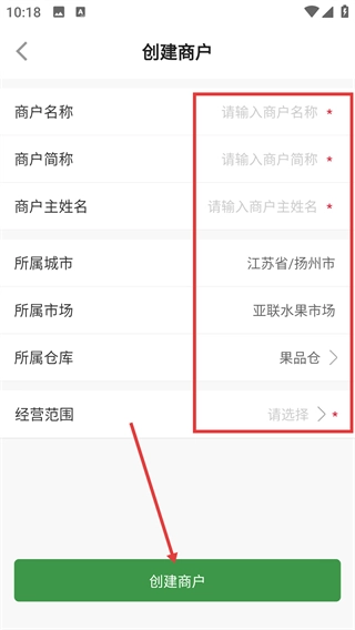 在商户创建界面,填写【商户名称】【商户简称】等必填项信息,确认无误后点击【创建商户】按钮,即可完成商户信息的提交操作。