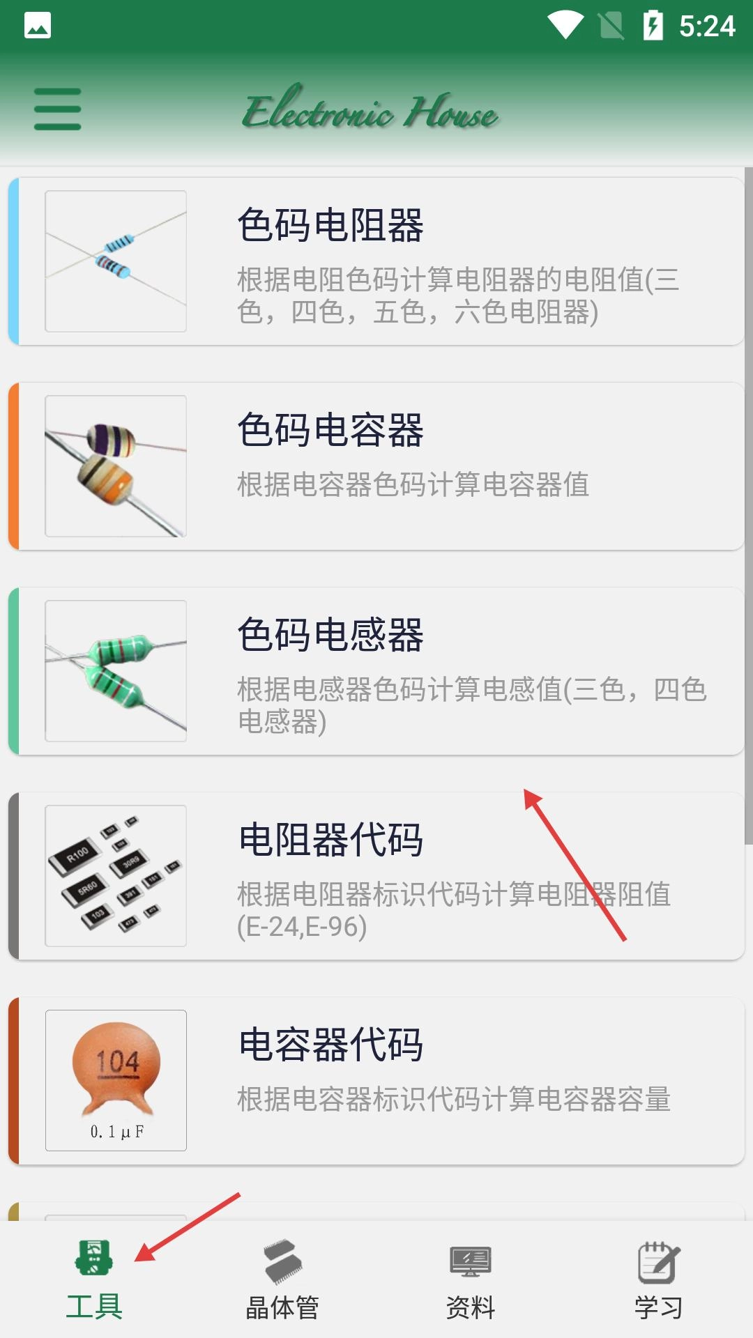 工具模块涵盖了色码电阻器、色码电容器、色码电感器、电阻器代码、电容器代码等多种功能。