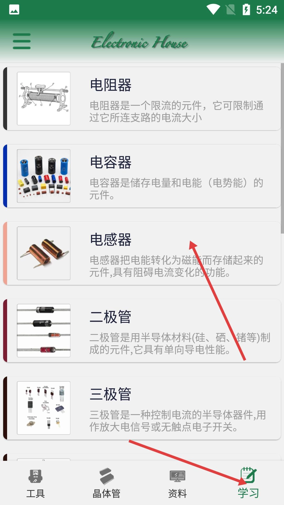 学习模块涵盖电阻器、电容器、电感器、二极管、三极管等电子元件的介绍,对各元件的功能与特性进行了详细阐述。