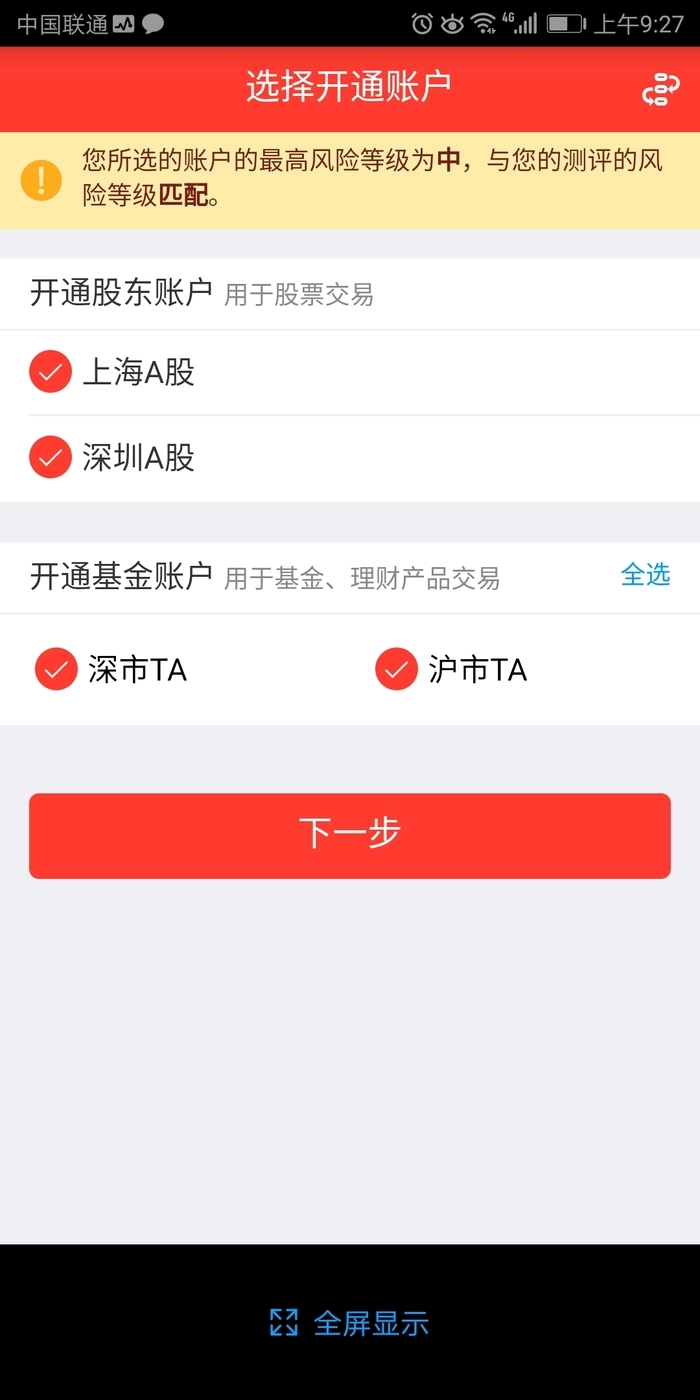 进入选择开通账户的界面后,把“股东账户”和“基金账户”对应的各项都勾选上,具体操作可参考下图,全部勾选完成后点击“下一步”按钮。