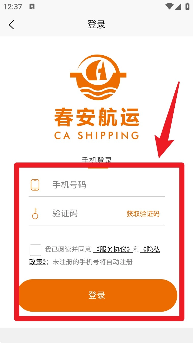 打开应用程序进入登录界面,填写手机号码和验证码,勾选服务协议后点击“登录”按钮以完成身份验证。