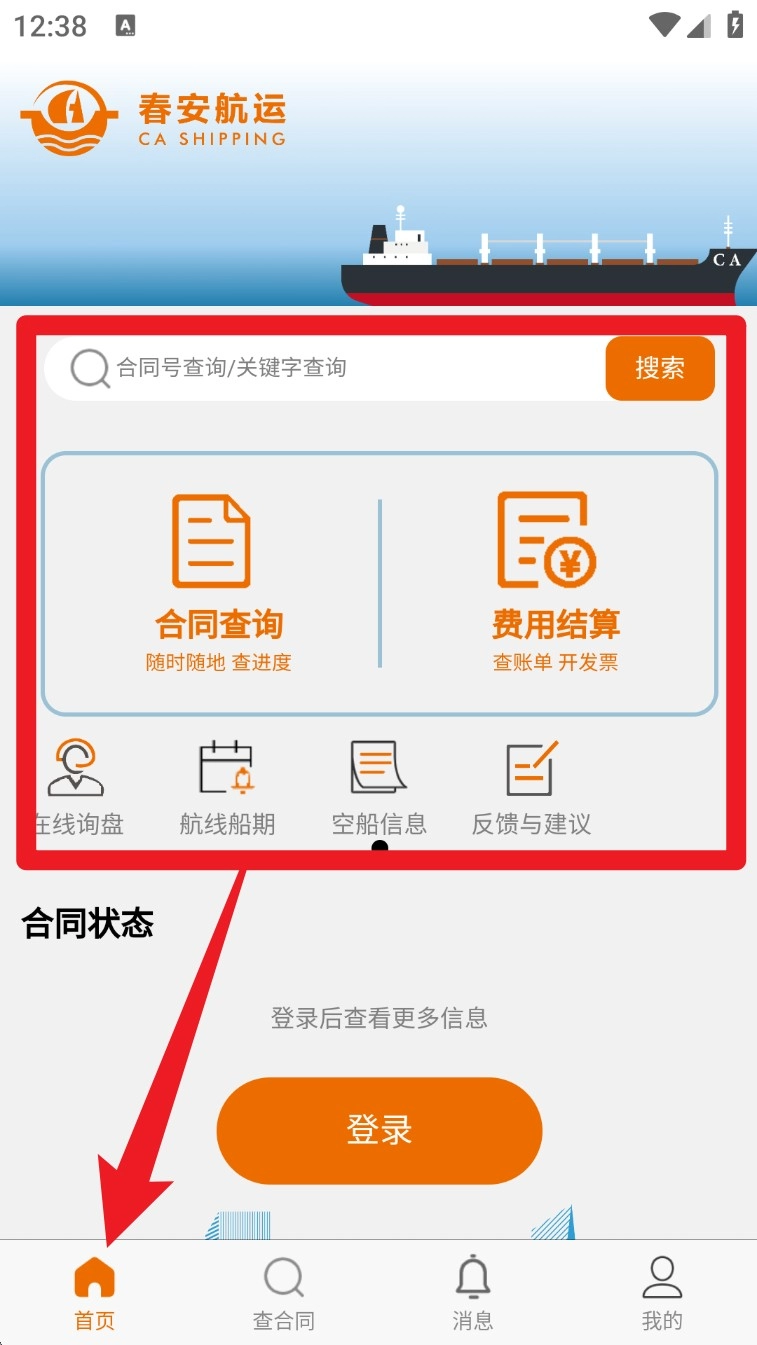 登录成功后,点击底部的“首页”按钮,就能在主页看到合同查询、费用结算、船期与空船信息等各项功能。