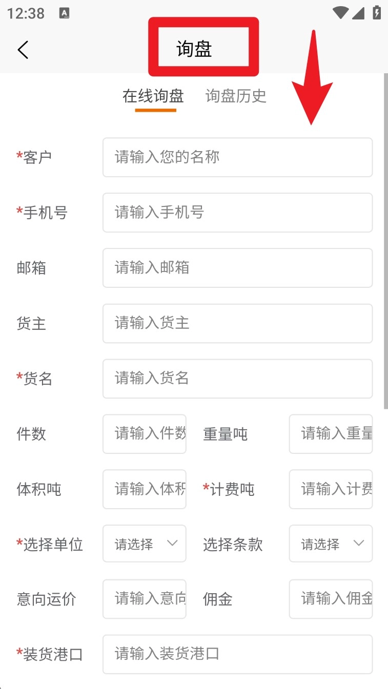 若需要提交货盘相关的请求,可点击“在线询盘”按钮,填写客户名称、货物名称、重量等必要信息,系统会自动保存这些内容并将其发送至后台处理。