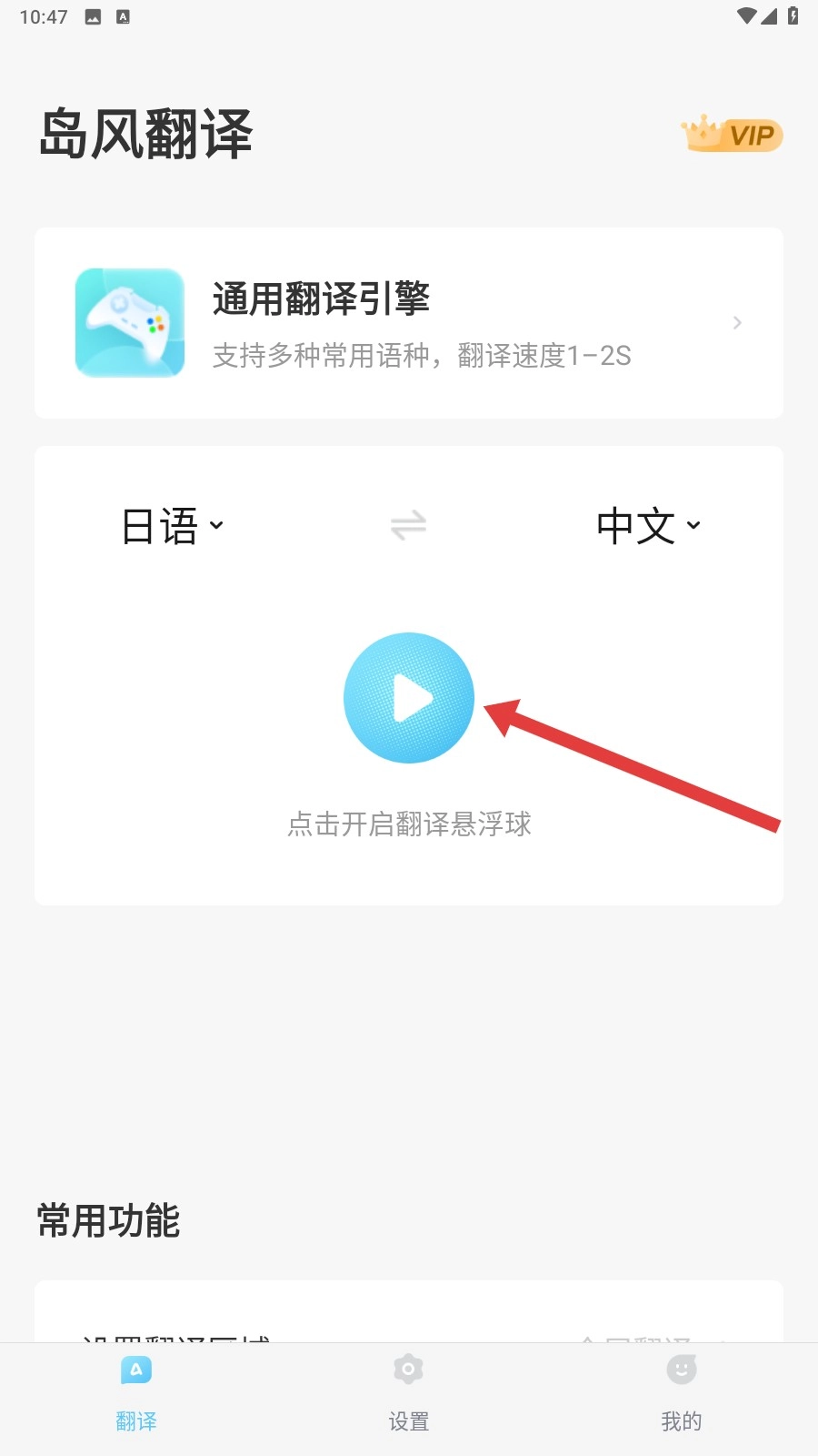 1、打开【岛风游戏翻译】,在翻译界面点击蓝色播放按钮,就能开启翻译悬浮球功能啦。