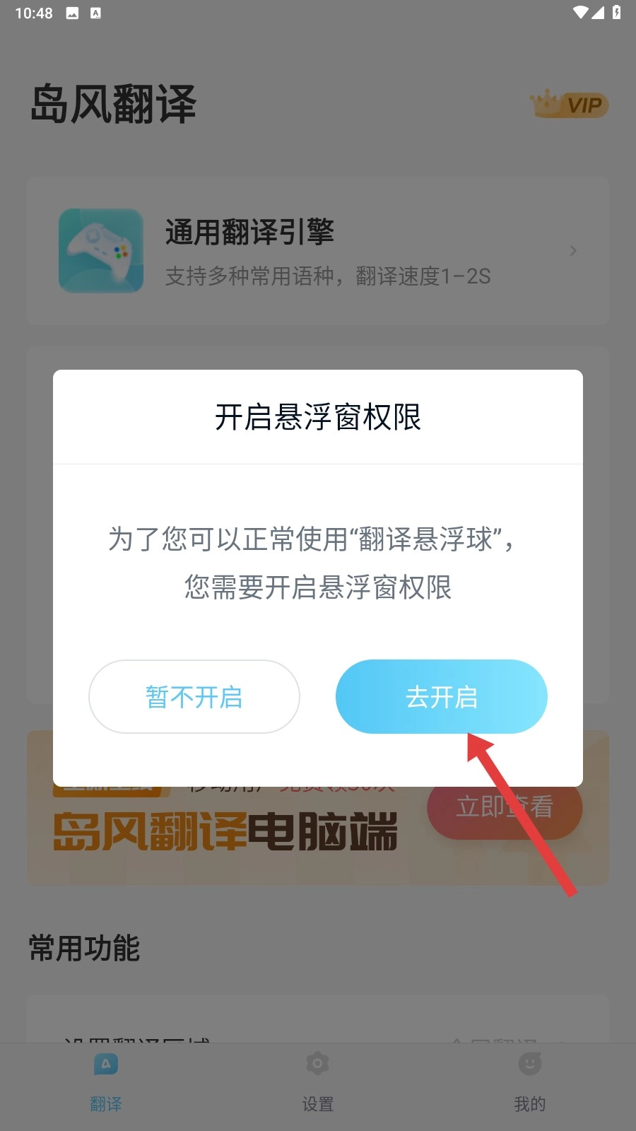 2、当弹出开启悬浮窗权限的提示时,点击【去开启】按钮,然后按照提示完成悬浮窗权限的设置就可以啦。