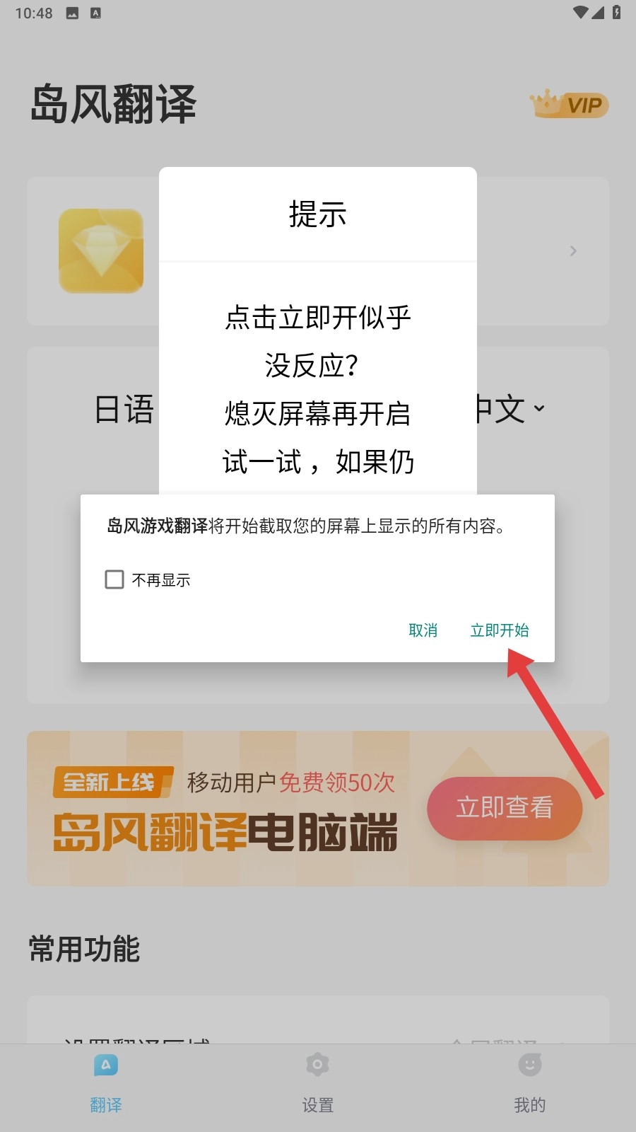 3、当出现屏幕截取的提示弹窗时,点击【立即开始】按钮,授权软件获取屏幕内容的权限,这样才能让翻译功能正常工作哦。