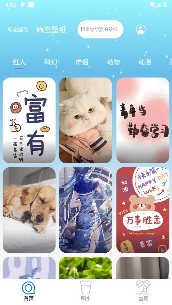 在这款软件里,用户仅需输入主题名称,就能一键解锁对应的壁纸,便捷完成安装与使用。这里的壁纸涵盖动态和静态两大类别,大家可以依据不同主题来挑选,像收藏夹、热门、小清新、游戏、动漫等应有尽有,海量的壁纸资源,总能让你找到心仪的那一款。除此之外,软件还支持用户在线制作饮水打卡、瑜伽打卡、肤色记录等内容,助力大家快速养成良好习惯,轻松实现个人健康管理。