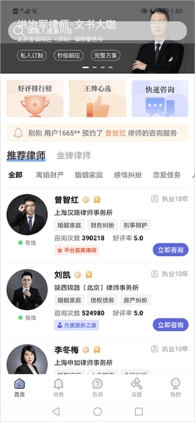 打开软件后,在首页的推荐律师或金牌律师板块里,挑选一位自己心仪的律师并点击进入。