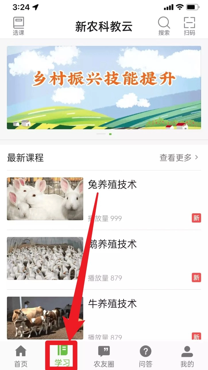 点击底部菜单的“学习”分页,就能查看养殖技术、种植方法等各类农业知识,还能进行分类筛选和收藏操作。