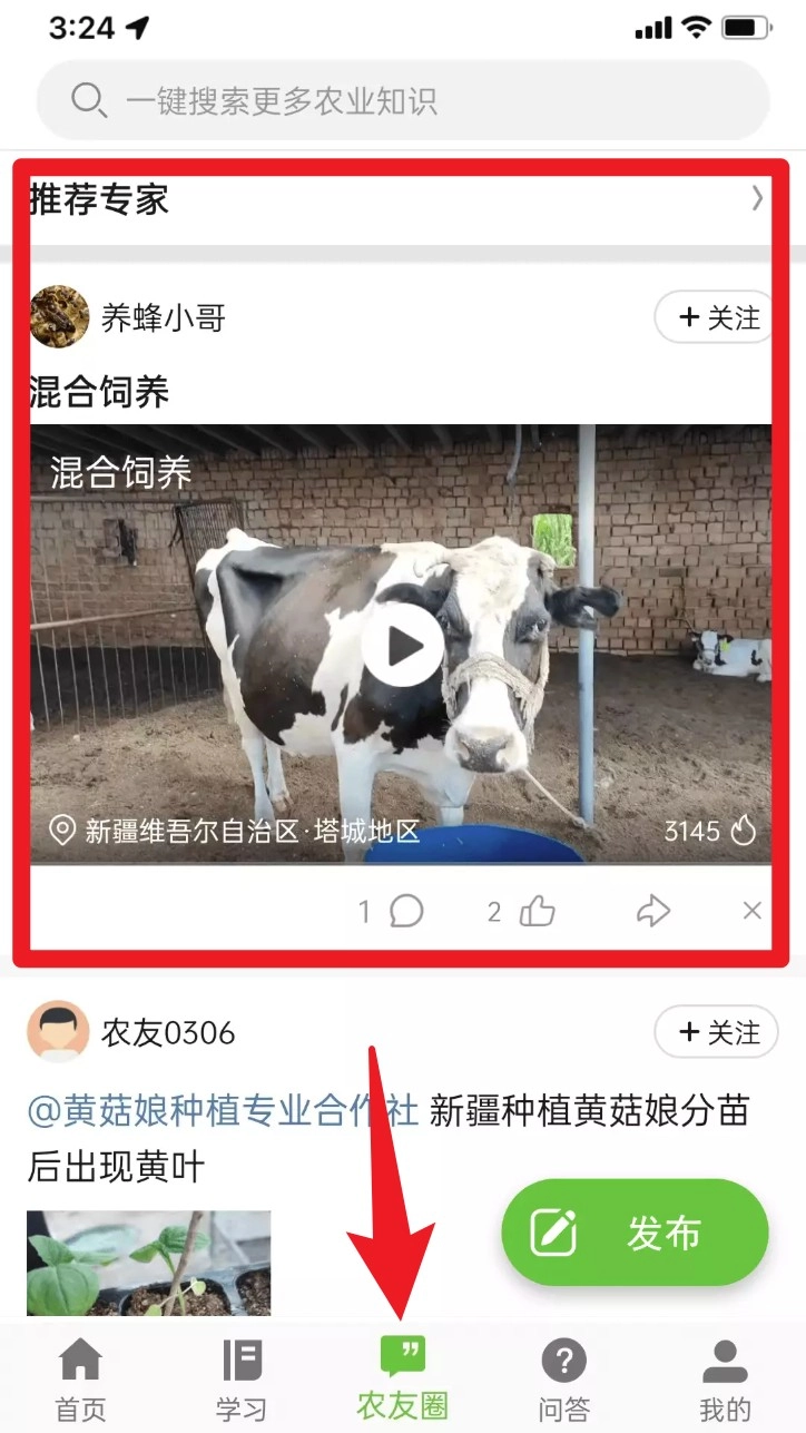 进入“农友圈”版块后,系统会为你推荐优质的农业专家和活跃用户,方便你查看他们分享的内容,或者进行关注和互动。