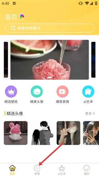 进入软件后,首先查看【首页】界面,你可以借助顶部的搜索栏来查找所需内容,另外,点击【表情】功能的入口就能使用该功能了。