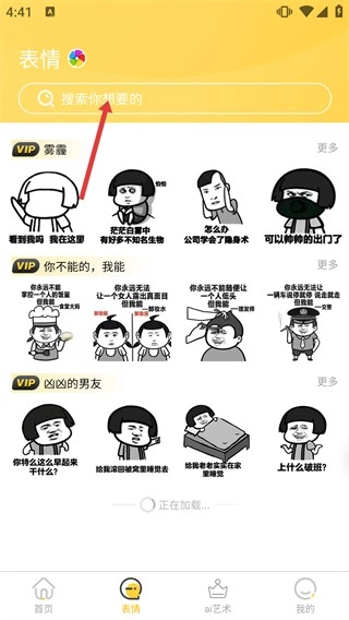 2、切换至【表情】页面,借助顶部搜索栏查找表情包,页面会呈现带有【VIP】标识的表情,点击分类旁边的“更多”按钮即可查看更多内容。