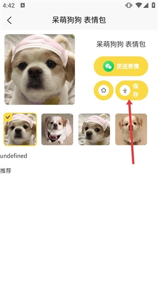 4、进入【呆萌狗狗表情包】的详情页面后,既可以点击【发送表情】按钮进行分享,也能够点击【保存】按钮把这个表情包存储到本地。