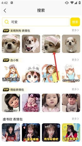 3、在【搜索】页面输入【可爱】这类关键词后,系统会呈现【呆萌狗狗表情包】【血小板】等相关分类,若想浏览所有分类,可点击“更多”按钮。