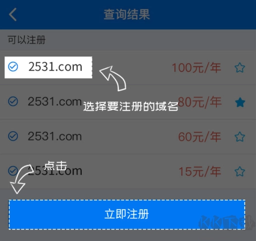 跳转到查询结果页面,挑选状态显示为“可注册”的域名,点击“立即注册”按钮进入信息确认步骤。