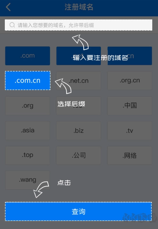 在注册页面输入想要注册的域名,挑选合适的后缀(比如.com、.cn这类),选好之后点击“查询”按钮,就能查看这个域名是否可以注册使用。