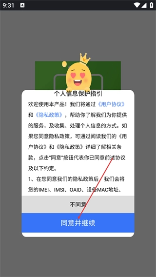 1、阅读【个人信息保护指引】后,点击【同意并继续】,可进入应用主界面。