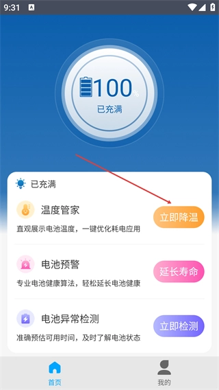 2、在首页找到【温度管家】功能,点击【立即降温】可启动手机降温流程。