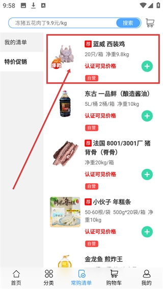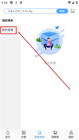 2、进入【常购清单】页面后,选择左侧的【特价促销】分类,可查看该分类下的相关商品内容。