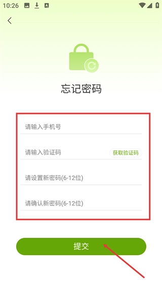 4、进入【忘记密码】页面后,填写【手机号】【验证码】并设置新密码,完成后点击【提交】即可重置密码。