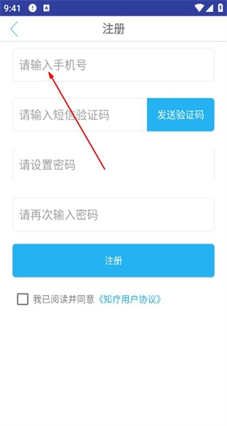 4、进入注册页面,依次填写手机号获取并输入验证码,设置并再次确认密码,勾选协议后点击注册完成操作。