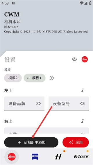 2、除徕卡外还支持添加索尼、佳能、尼康等其他知名相机品牌的水印,实现跨品牌的一站式标识解决方案。