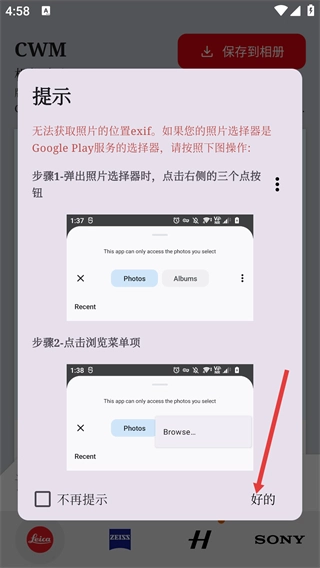 3、弹出获取照片位置的提示弹窗后,阅读操作指引,点击【好的】按钮关闭弹窗继续操作。