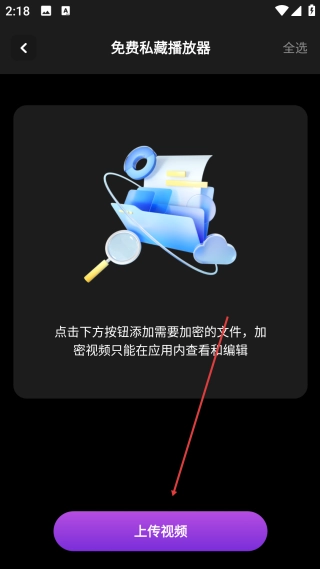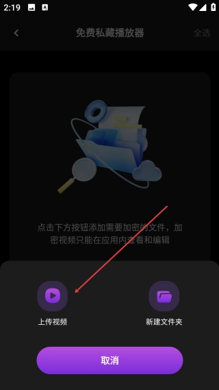 2、在私藏播放器页,点击【上传视频】按钮,弹出操作选项的选择弹窗。