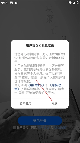 2、阅读【用户协议】和【隐私政策】,了解信息收集及授权规则后,点击弹窗中的【同意】按钮以继续后续操作。