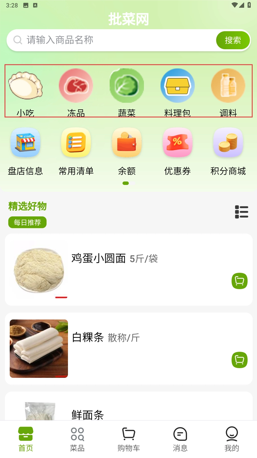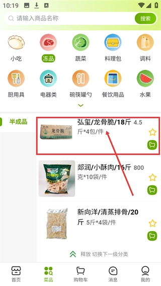 1、在首页选【小吃】【冻品】等分类,进入食材/商品列表页。