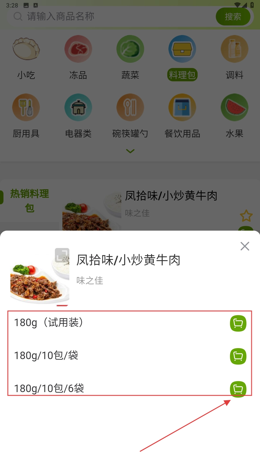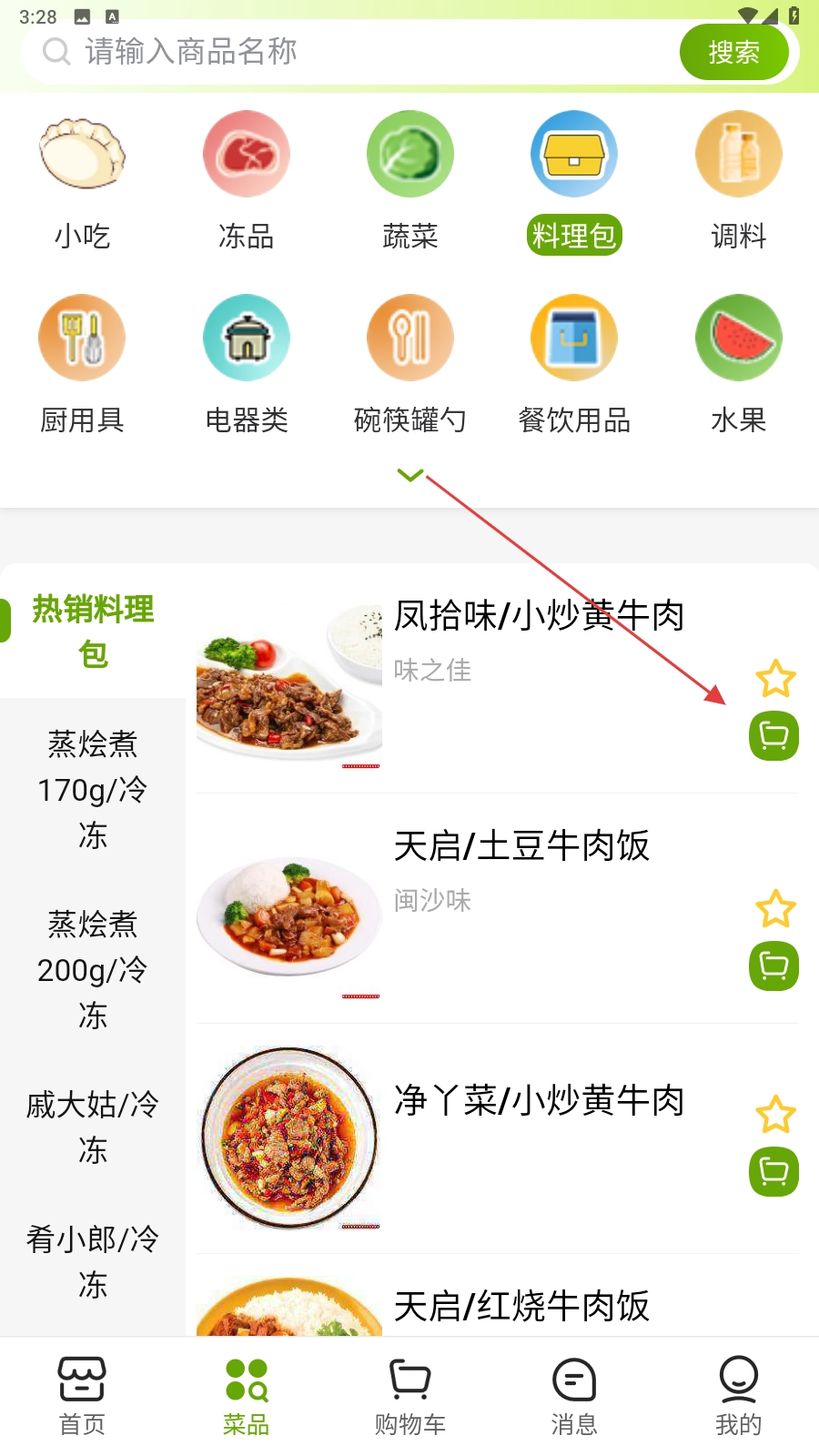 2、点【料理包】分类,选【凤拾味/小炒黄牛肉】等商品的购物车图标。