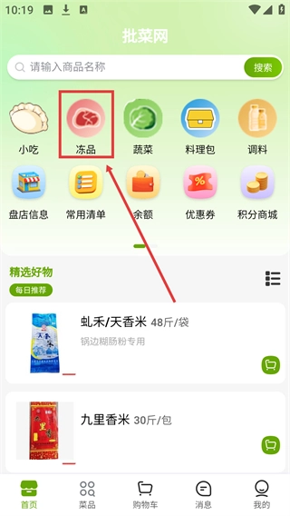 1、在首页找到【冻品】分类按钮并点击,可进入冻品类商品的展示页面,查看相关货品。