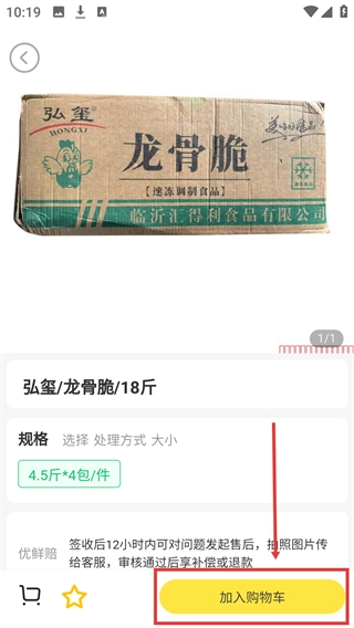 2、进入【冻品】分类页面后,找到【弘玺/龙骨脆/18斤】商品,点击可进入其详情页。