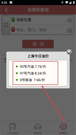 4、点击【最新油价】区域,会弹出【上海今日油价】弹窗,可查看93号汽油、97号汽油及0号柴油的实时价格。