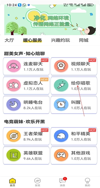 2、进入暖心服务页面,看到甜美女声虚拟恋人等服务分类,选择给你唱歌分类,准备查看该服务的提供用户。