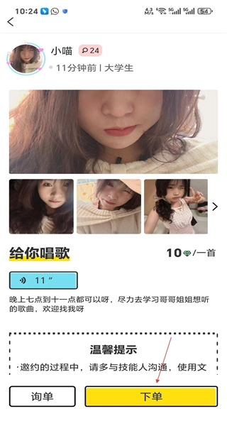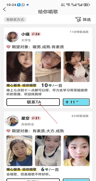 3、进入给你唱歌服务页面,浏览展示的服务用户,选择目标用户小喵,点击联系TA按钮进入该用户的详情页。