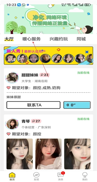 1、打开软件后,进入大厅页面看到新人秀及用户列表,找到底部暖心服务选项,点击进入对应板块。