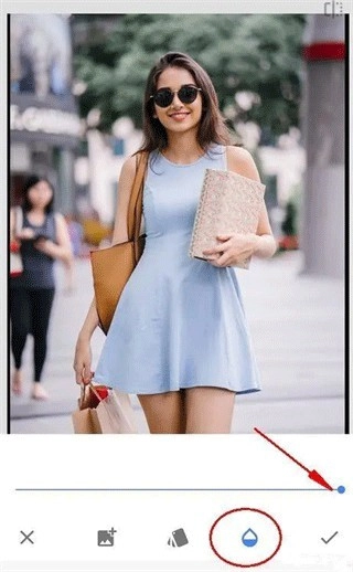 4、点击第三个不透明度工具,把不透明度调到最大,只需将滑块拖至最右端,接着点击√确认图片修改,就能回到主菜单。