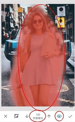 7、进入蒙版界面后,需留意相关参数。此时双重曝光的参数值为100,用画笔在图片上涂抹后,被涂抹的区域就会呈现出人物图像。这表明,当我们以双重曝光数值100对图片进行涂抹操作时,图片会显示出后续添加的人物图片;相反,若将双重曝光参数调整为0后再进行涂抹,图片则会重新呈现出以车辆为背景的效果。