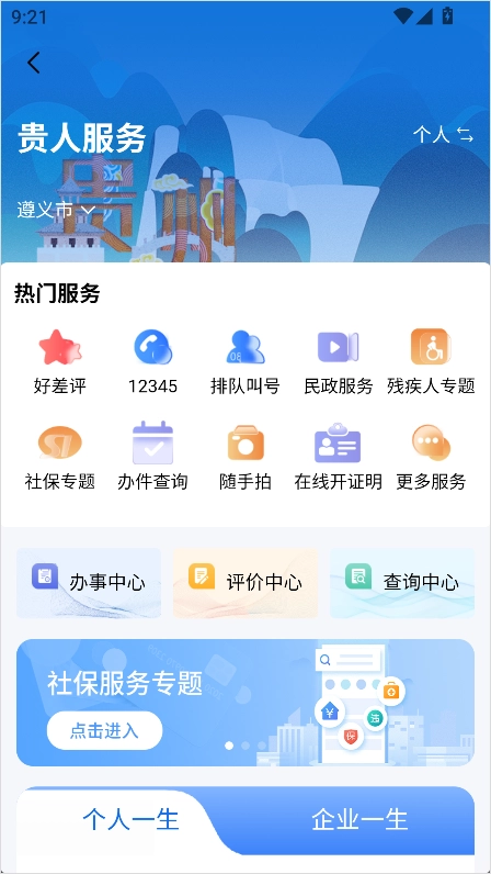 打开i遵义首页,页面上集成了区县部门专区、人才服务、社保相关等常用功能入口,这些都能清晰看到。
