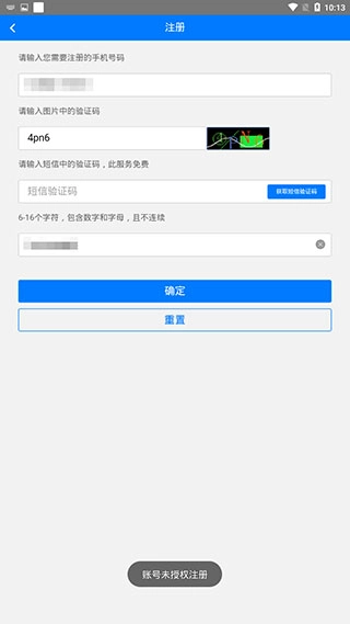 要是你的手机号码没有经过授权,点击注册按钮之后,页面就会显示【账号未授权注册】的提示。