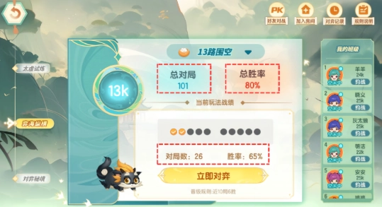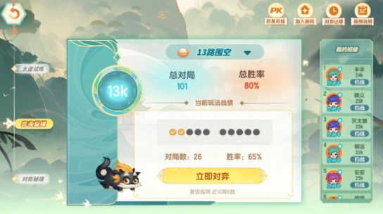 对弈大厅的“弈海纵横”模块特别新增了总对局数与胜率数据的实时展示功能,方便小棋士们及时了解个人对战情况,更清晰地掌握自己的对弈表现!