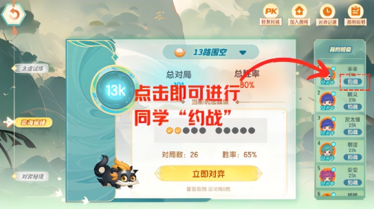 只需轻轻一点就能发起“约战”,邀请同班同学进入专属对战室,开启属于你们的专属棋局!