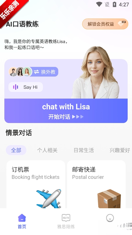 功能描述:提供多种真实场景(如机场、餐厅、商务谈判等),用户与AI在特定场景下进行对话练习。