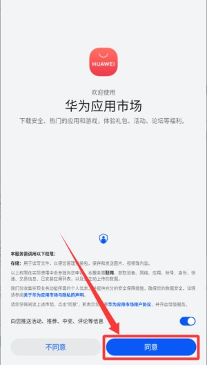 2、接着登录华为市场,点击右下角的同意按钮进入。