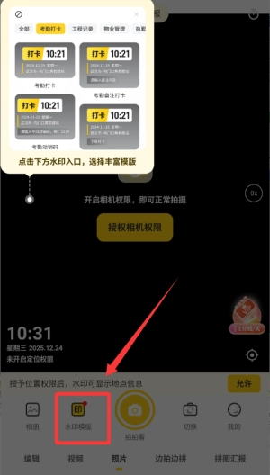 1、通过水印拍照功能,先打开相机,接着从模板库中选择合适的水印,就能开始拍摄,拍摄的照片会实时添加上所选水印。