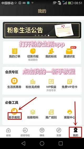 打开粉象生活应用,接着点击“我的”页面,稍微向下滑动屏幕,找到“新手教程”并点击进入。进入后会看到三个标题,分别是新手教程、版本更新和粉象生活小技巧。无论你是刚接触粉象生活的新手,还是已经使用很久的老用户,都建议花十分钟时间把这些内容完整看完。