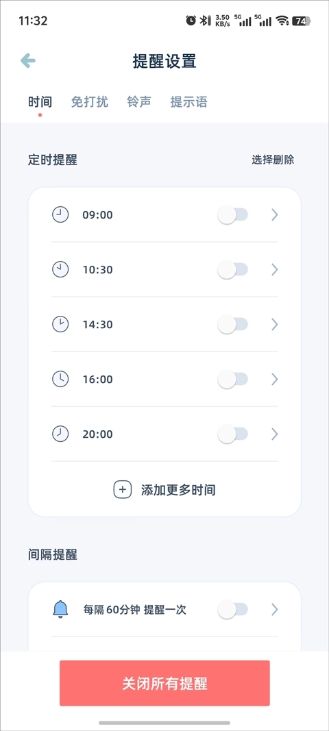 2、可以关闭下方已开启的定时提醒,也可以点击下方关闭所有提醒,这样就能在安静的环境中使用,同时保证正常饮水。