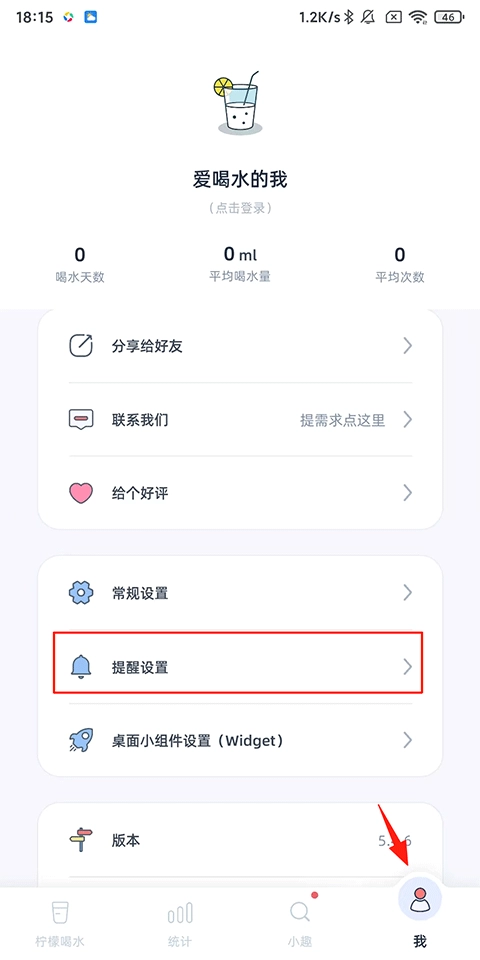 1、打开柠檬喝水应用,点击底部导航栏的【我】,进入个人中心页面后找到【提醒设置】选项并点击,查看该设置选项里包含的各项功能。